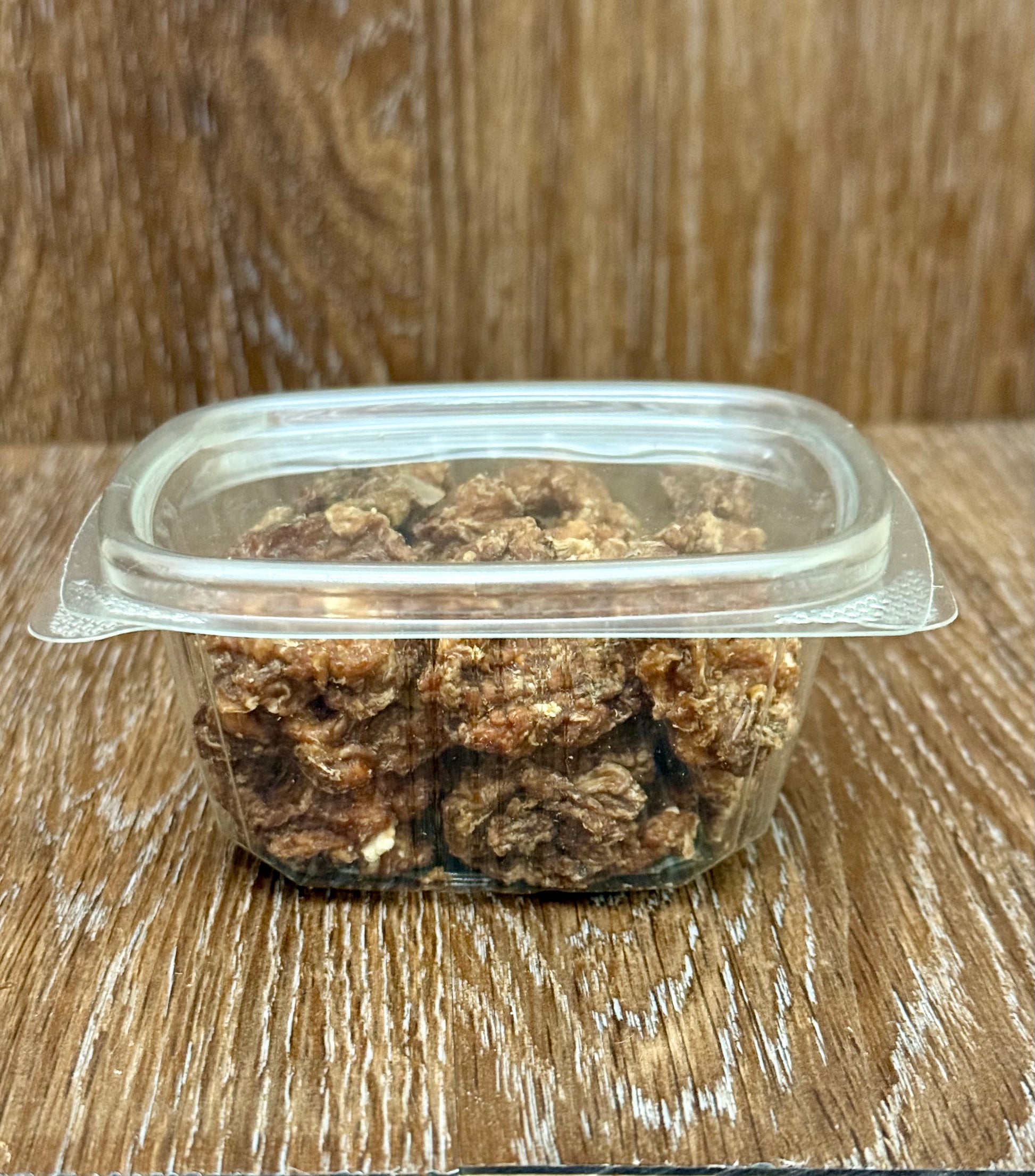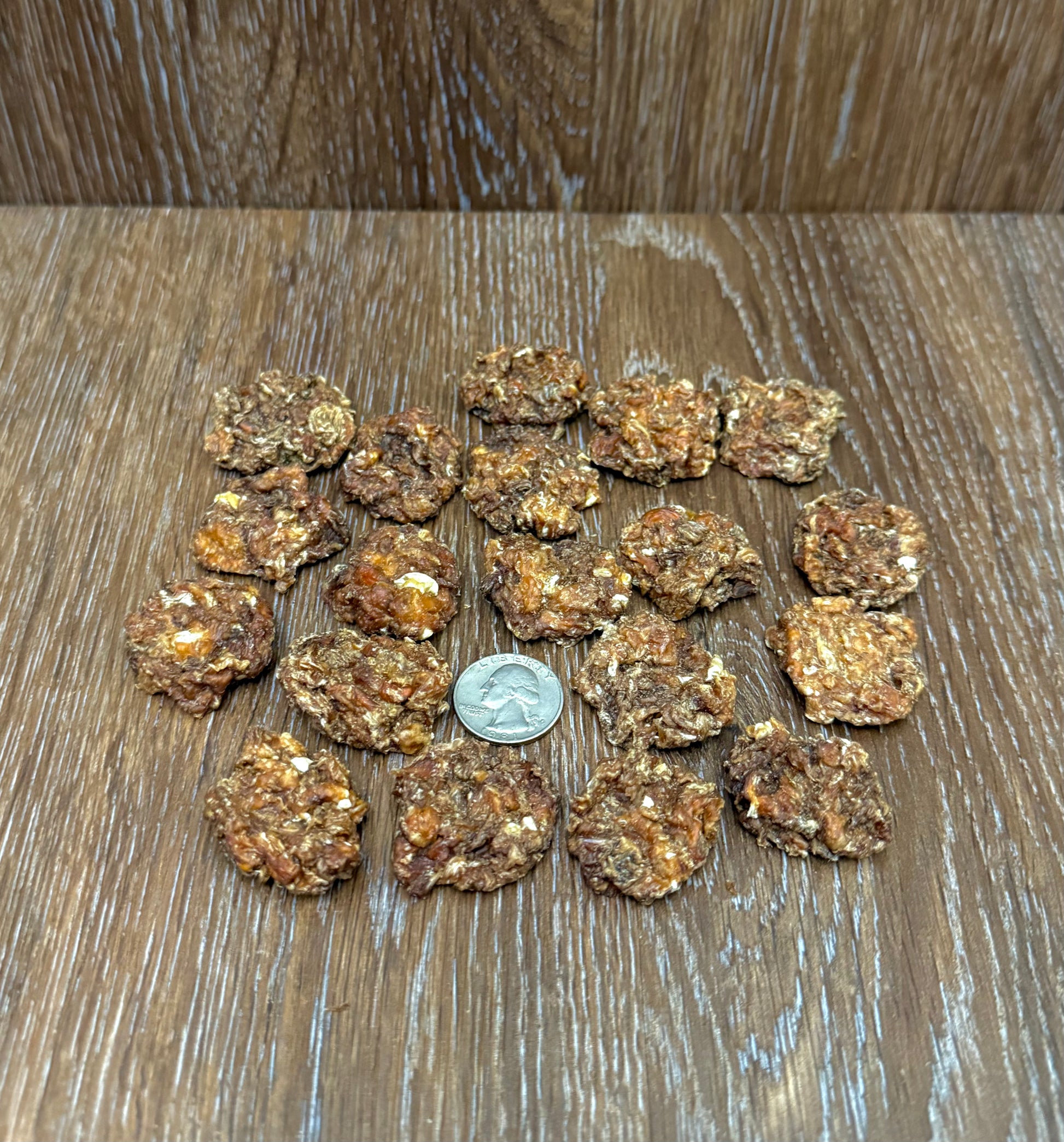 These adorable little "nuggets" are made from the ground chicken meat, cartilage, tendons, and ligaments. Each order will contain at least 2.5 ounces of dried chicken nuggets, which amounts to 12 ounces of fresh ground chicken! (I placed a quarter in the second photo to give you a reference for how much it is!)